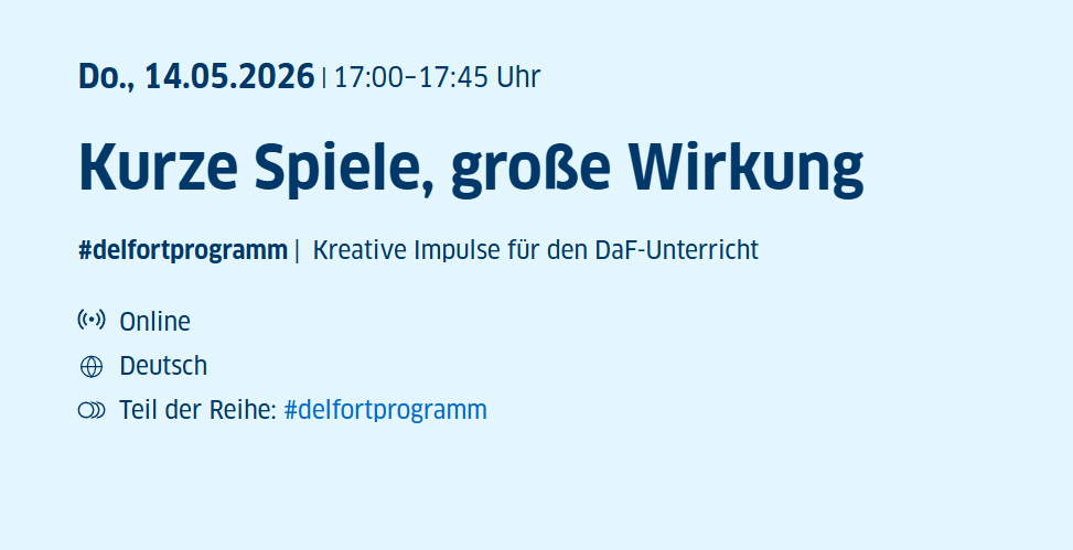 Suchen Sie nach kurzen, wirkungsvollen Spielen, die Ihren Unterricht abwechslungsreicher und lebendiger machen? In diesem Kurzwebinar im Rahmen der Reihe #delfortprogramm am 14.05.2026 von 17:00 bis 17:45 Uhr erhalten Sie praxiserprobte Impulse, die Sie sofort in Ihrem Unterricht einsetzen können – kompakt, inspirierend und direkt umsetzbar.