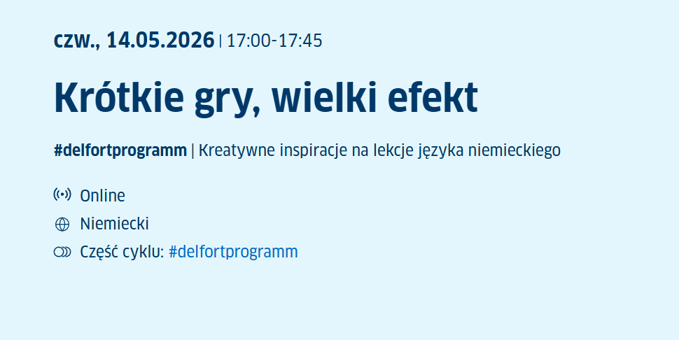 Szukają Państwo krótkich, skutecznych gier, które urozmaicą i ożywią lekcje języka niemieckiego? Podczas tego krótkiego webinarium w ramach cyklu #delfortprogramm poznają Państwo sprawdzone w praktyce pomysły, które można bezpośrednio wykorzystać na lekcjach.