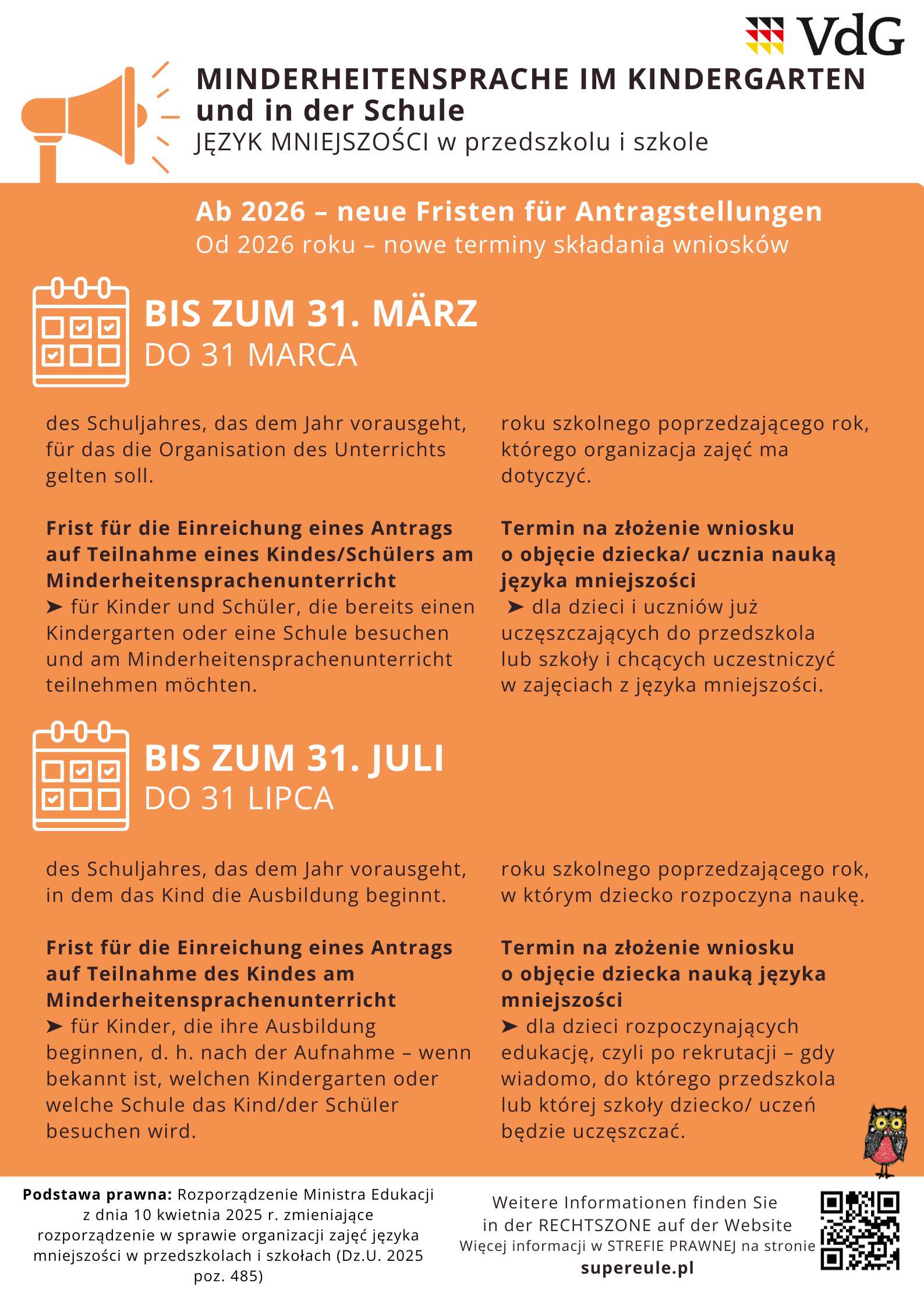 Od obecnego roku szkolnego obowiązuje nowe rozporządzenie Ministerstwa Edukacji Narodowej. Wprowadza ono jasne zasady dotyczące terminów składania wniosków o objęcie dziecka nauką języka niemieckiego jako języka mniejszości narodowej.