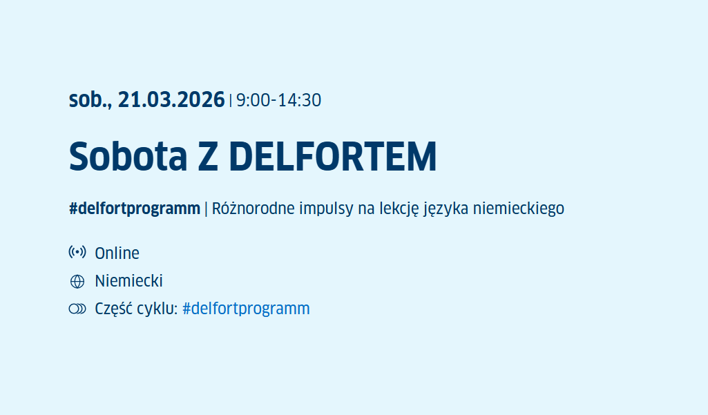 SOBOTA Z DELFORTEM to wspólna inicjatywa Goethe-Institut Warschau oraz Ośrodka Rozwoju Edukacji (ORE), przygotowana z myślą o nauczycielach, którzy w tygodniu nie mają przestrzeni na doskonalenie zawodowe, a chcą rozwijać swoje kompetencje w wygodnej, weekendowej formule.
