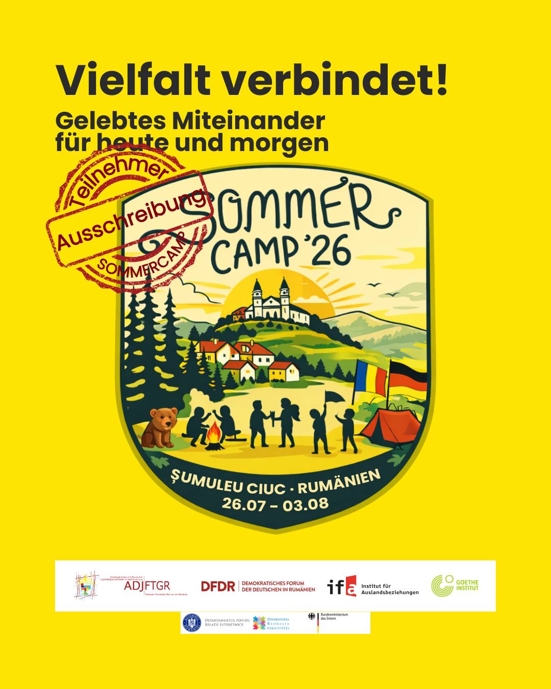 Serdecznie zapraszamy młodzież należącą do mniejszości niemieckiej do udziału w „Obozie letnim 2026 – Różnorodność łączy!”. Odbędzie się on w dniach od 26 lipca do 3 sierpnia 2026 r. w Șumuleu Ciuc w Rumunii, a jego motto brzmi: „Różnorodność łączy – wspólne życie dzisiaj i jutro”.